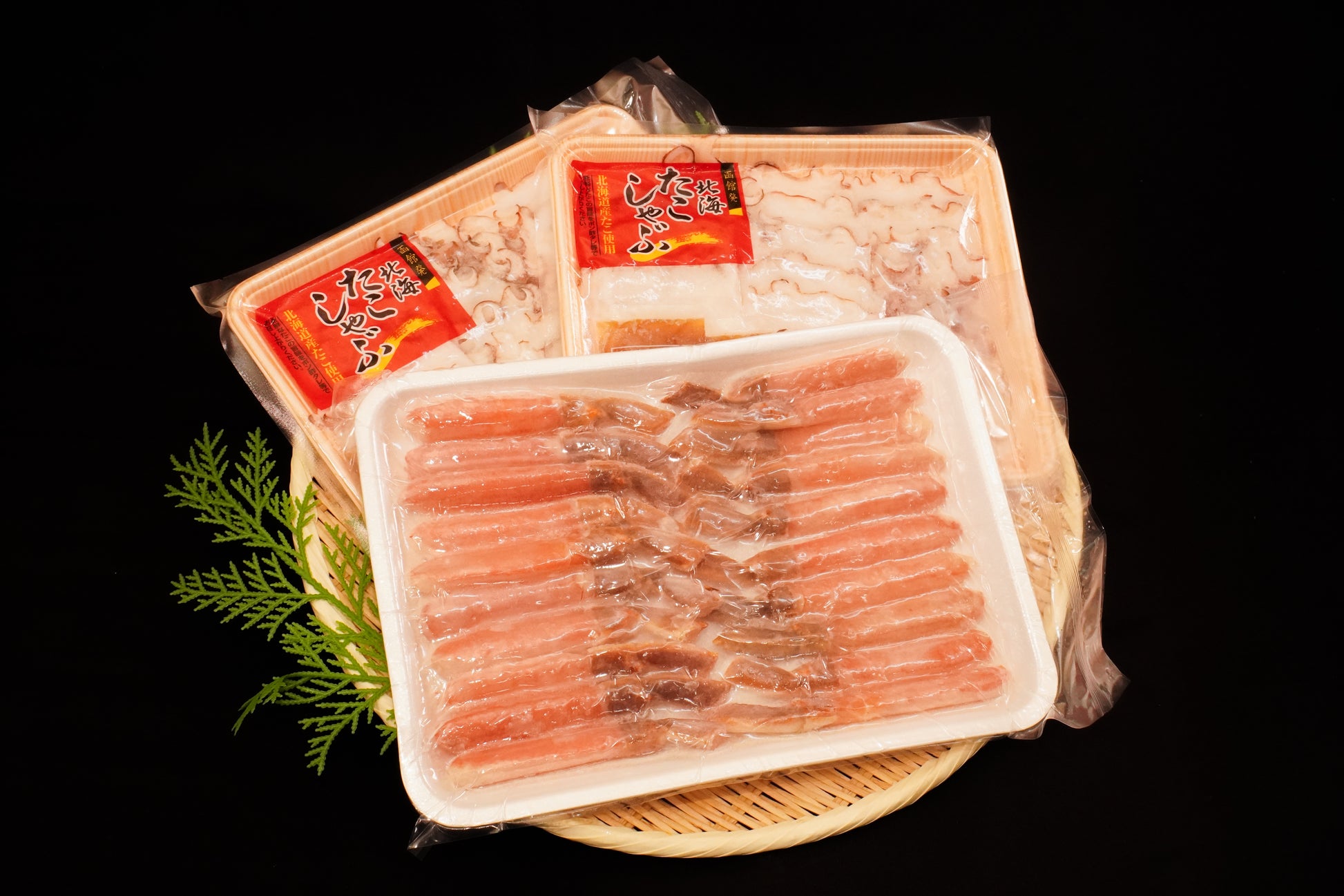 ②:北海道産たこしゃぶ(130g)×2パック入 大ぶりの厳選した、本ズワイ蟹と旨みたっぷりのタコをお届けいたします。